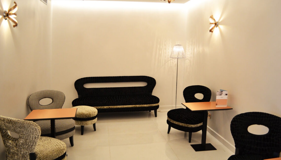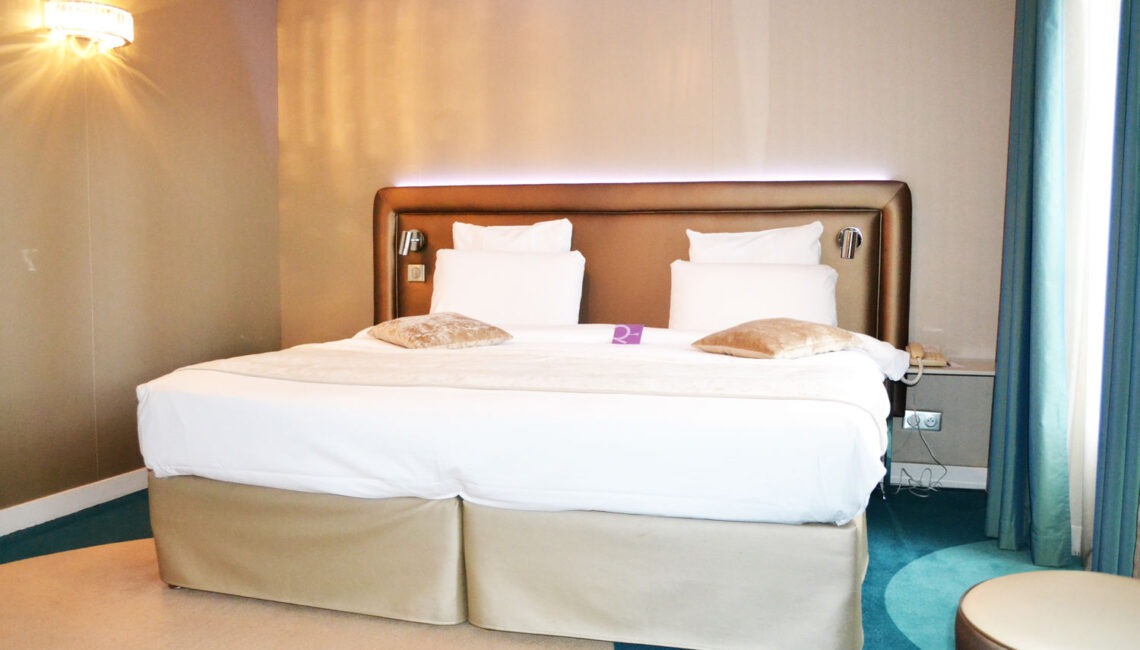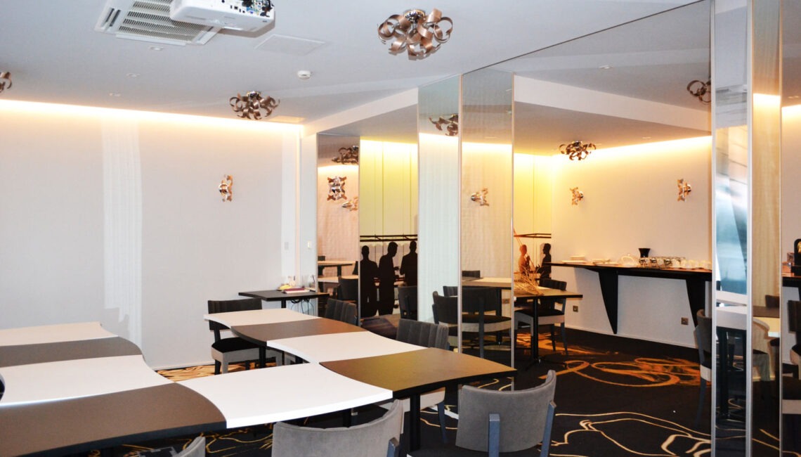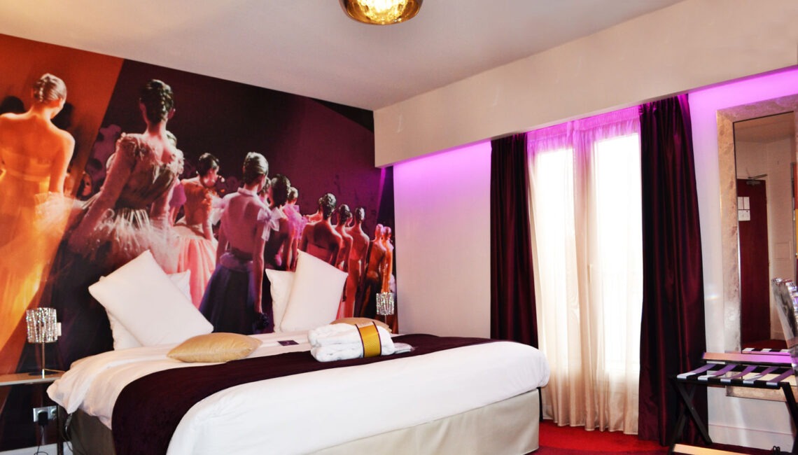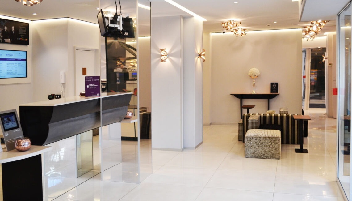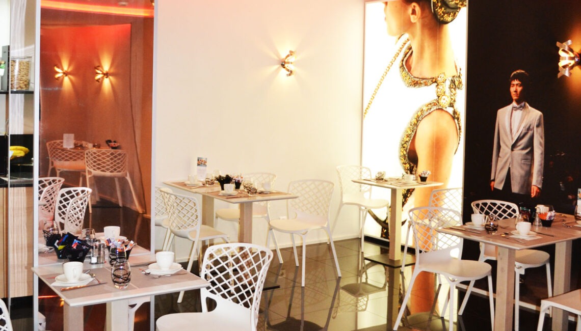 Rénovation totale de l'hôtel tous corps d'état sur le thème de la mode : hall d'accueil, salle de conférence, salle petit déjeuner, couloirs, chambres.